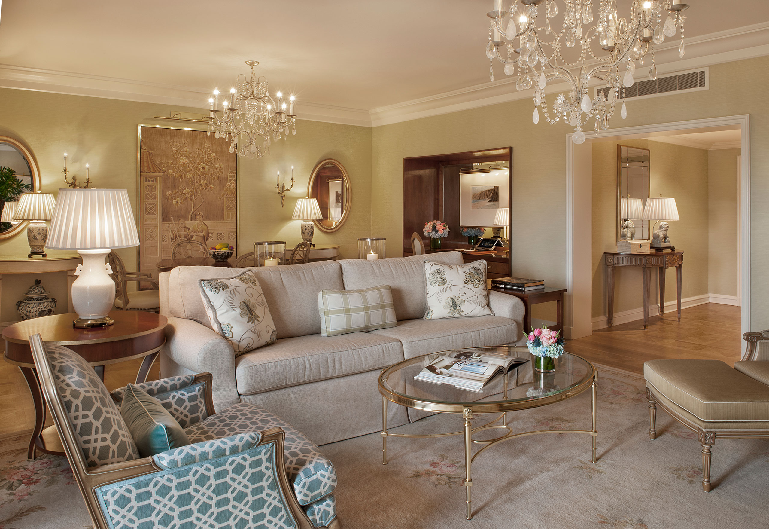 - The Peninsula Suite boasts spectacular views of the city and the hills beyond. This Presidential Suite is also known as the 'Green Suite' with walls upholstered in soft greens with framed antique Asian textiles and a grand piano. Its dining room, modern kitchen and spacious seating area make this an ideal suite for guests who enjoy entertaining.