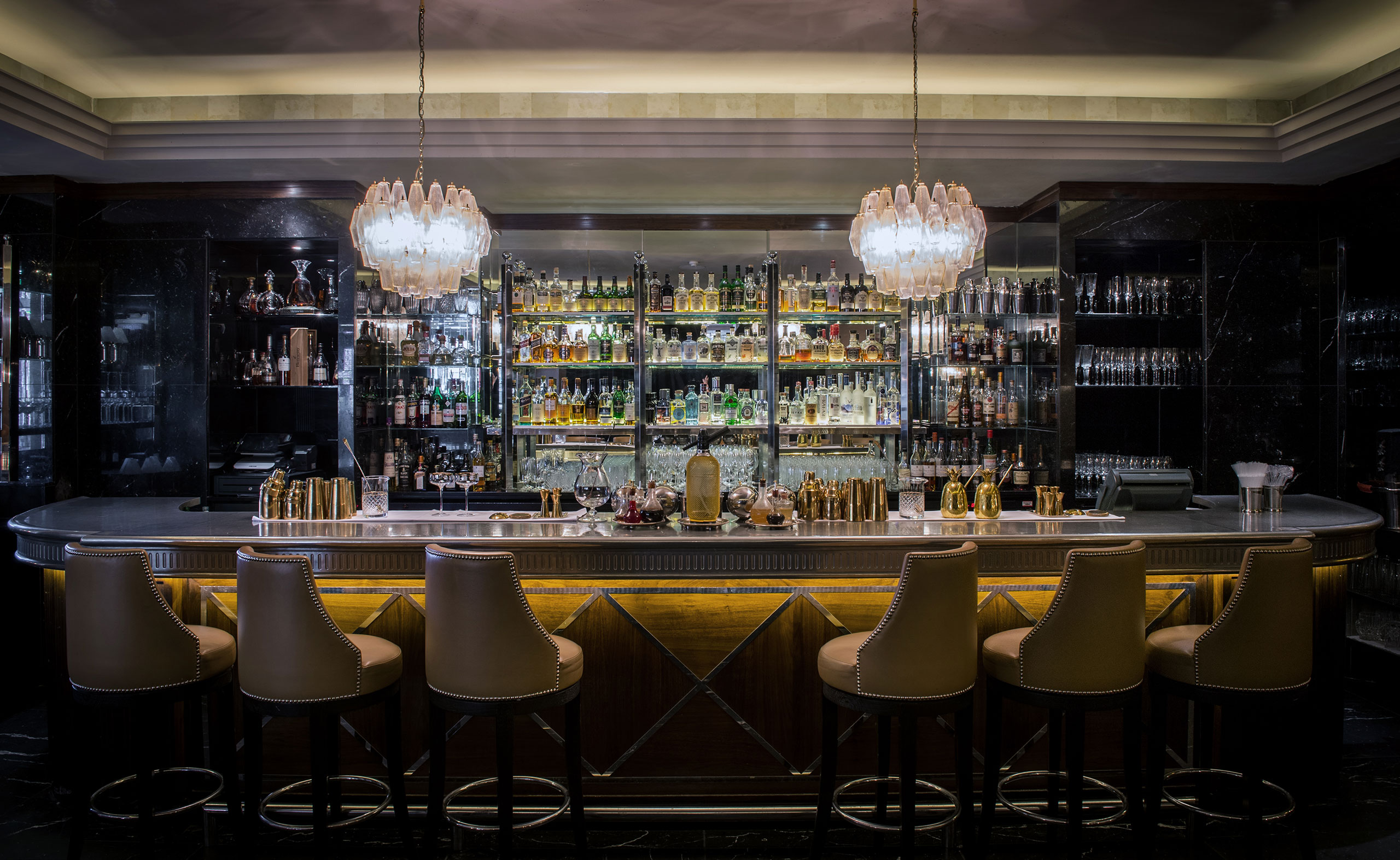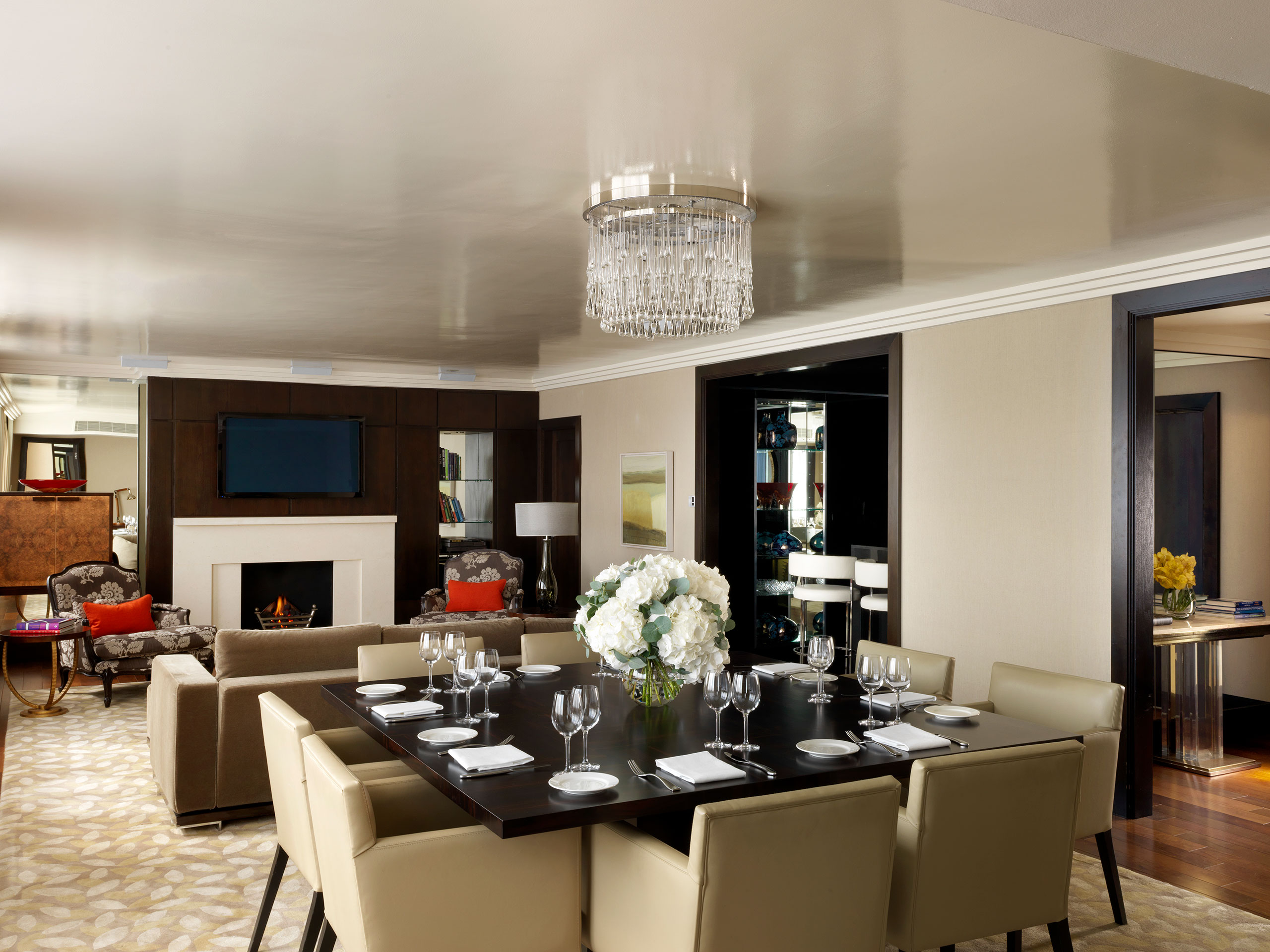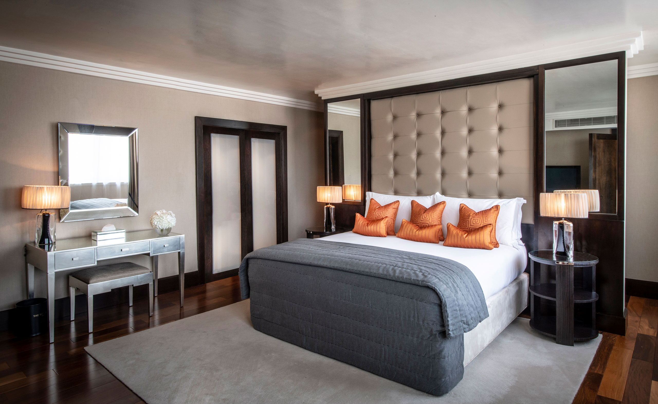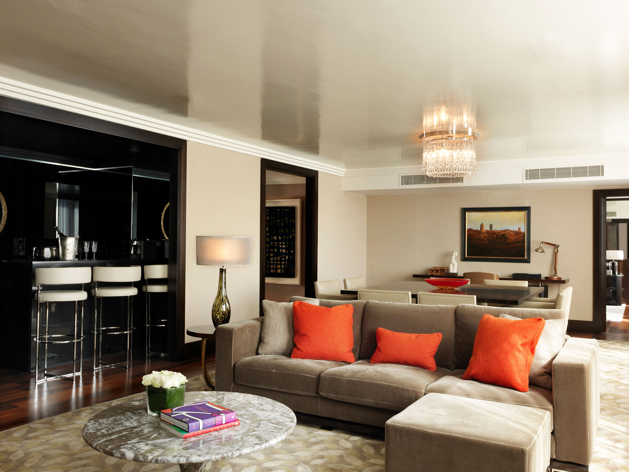 The secluded Presidential Suite occupies a tucked-away wing of the hotel, with a 1,500ft2 (140m2) living space comprising a separate living area and chic bar, dining area and lounge, decorated with sleek designer furniture and original artworks, while the exceptionally large, black marble-clad bathroom comes with double vanity unit, free-standing roll-top bath, and separate shower, steam room and sauna.
