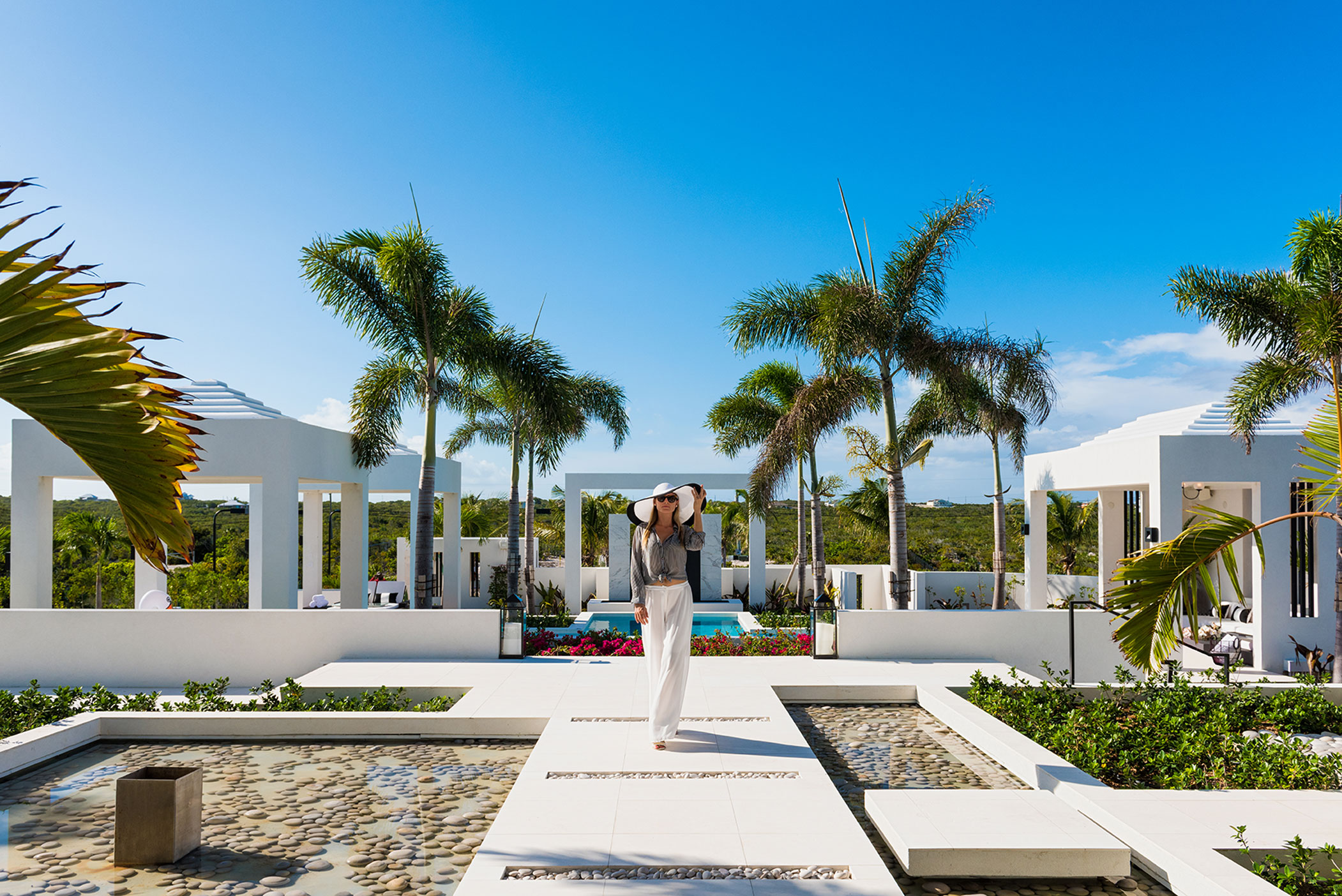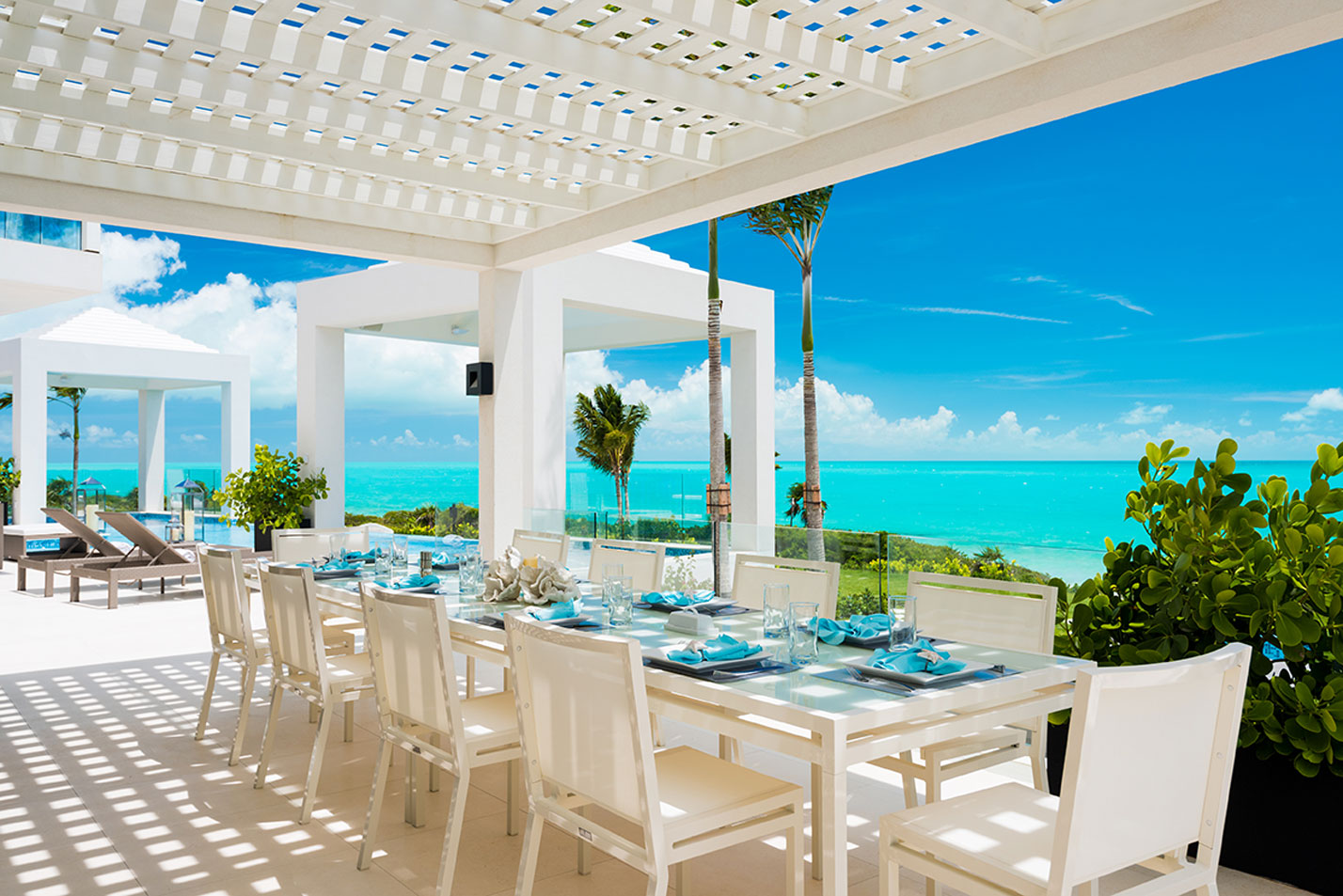Triton Luxury Villas is a fully-staffed seven-bedroom vacation home featuring modern architecture and design, expansive landscaped grounds and two heated swimming pools including an ocean-facing glass-front pool and hot tub. Additional facilities include an outdoor cinema, gym, private tennis court and bocce court